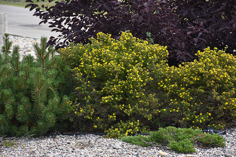 A popular larger spreading variety with showy bright yellow flowers from June until frost and fine textured light green foliage; the ultimate flowering shrub for northern gardens, hardy, tough and adaptable to all conditions, but dislikes wet soils