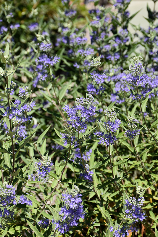 Blue Mist Caryopteris will grow to be about 3 feet tall at maturity extending to 4 feet tall with the flowers, with a spread of 3 feet. It tends to fill out right to the ground and therefore doesn't necessarily require facer plants in front. It grows at a medium rate, and under ideal conditions can be expected to live for approximately 20 years.
